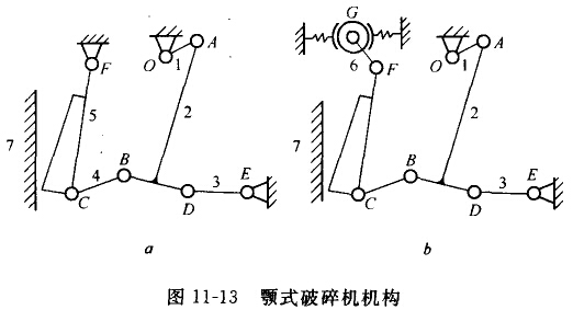 圖11-13a所示為現(xiàn)有顎式破碎機(jī)的運(yùn)動(dòng)簡(jiǎn)圖。該結(jié)構(gòu)由曲軸1、構(gòu)件2、3、4、顎板5、機(jī)架6等6個(gè)構(gòu)件和O、A、B、C、D、E、F等7個(gè)轉(zhuǎn)動(dòng)副組成,是一個(gè)單自由度全鉸鏈平面連桿機(jī)構(gòu)。曲軸1為主動(dòng)件,顎板5為從動(dòng)件,機(jī)構(gòu)具有確定運(yùn)動(dòng):當(dāng)主動(dòng)件曲軸1繞軸心O連續(xù)轉(zhuǎn)動(dòng)時(shí),從動(dòng)件領(lǐng)板5繞軸心尸往復(fù)擺動(dòng),從而將礦石軋碎。