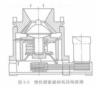 如圖8-8為慣性圓錐破碎機(jī)的結(jié)構(gòu)圖,工作機(jī)構(gòu)由定錐和動(dòng)錐 組成,動(dòng)錐軸插入軸套中,電動(dòng)機(jī)的旋轉(zhuǎn)運(yùn)動(dòng)通過傳動(dòng)機(jī)構(gòu)傳給固定在軸套上的激振器,激振器旋轉(zhuǎn)產(chǎn)生慣性力,使動(dòng)錐繞球面支撐的球心做旋擺運(yùn)動(dòng),從而使破碎腔的物料產(chǎn)斗強(qiáng)烈脈動(dòng)沖擊。從而對(duì)物料進(jìn)行破碎。