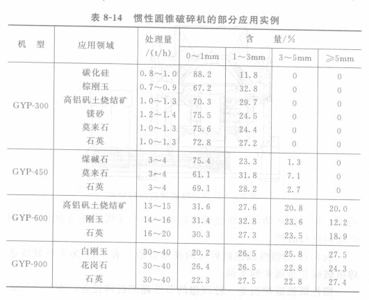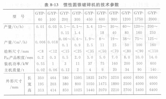 表8-13為慣性圓錐破碎機(jī)的技術(shù)參數(shù),表8-14為慣性圓錐破碎機(jī)破碎非金屬礦的實(shí)例。