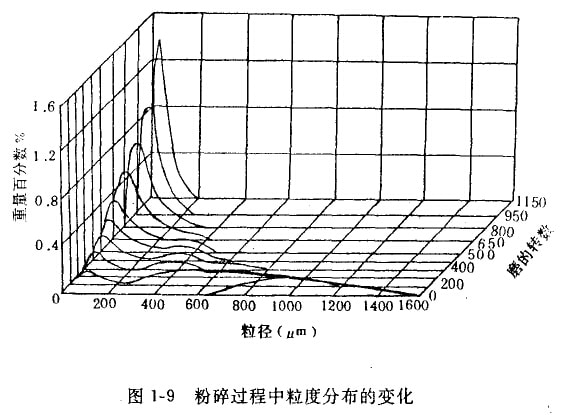 為此海伍德(Hey—wood)在一個(gè)小磨機(jī)中做研磨煤的一系列實(shí)驗(yàn),其結(jié)果如圖1—9所示。其中產(chǎn)品顆粒粒度的分布以磨機(jī)累積轉(zhuǎn)數(shù)的函數(shù)表示。原始的粒度分布顯示小一個(gè)單峰型,它相當(dāng)于比較粗的顆粒。當(dāng)粉碎比逐步增加時(shí),這峰型就逐漸減小并且在一特定的粒度產(chǎn)生第二個(gè)峰型。這過程一直進(jìn)行到第一個(gè)峰型完全消失時(shí)為止。第二個(gè)峰型是物料的特征,稱為持久峰型,而第一個(gè)蜂型稱為暫時(shí)峰型。