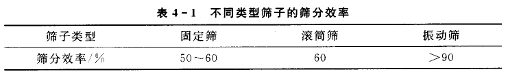 篩于運(yùn)動(dòng)方式對(duì)篩分效率有較大的影響,同一種團(tuán)體廢物采用不同類型的 篩子進(jìn)行篩分時(shí),其篩分效率大致如表4—1所示。