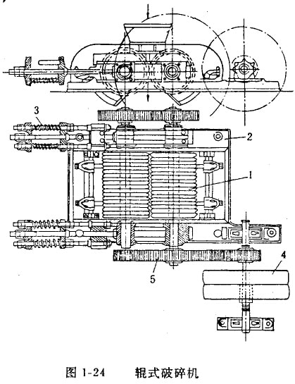 圖1—24所示為輥式破碎機(jī)。破碎輥1固裝在破碎機(jī)架2上,另一個(gè)破碎輥在彈按壓力下作水平滑動(dòng)。裝在這個(gè)輥上的彈簧3是對(duì)非破碎物(鏟齒、鐵塊等)的保護(hù)裝置。為了防止加入物料與兩輥發(fā)生摩擦,兩個(gè)破碎輥的轉(zhuǎn)速相等。出電動(dòng)機(jī)通過(guò)三角皮帶輪4和齒輪5帶動(dòng)固定輥,再通過(guò)適當(dāng)?shù)膫鲃?dòng)裝置帶動(dòng)滑動(dòng)輥。也有的設(shè)計(jì)成每輥各有一臺(tái)電動(dòng)機(jī)分別傳動(dòng)。