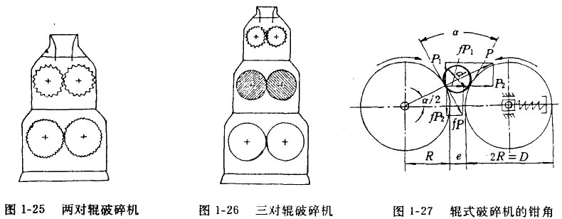 為了提高輥式破碎機(jī)的破碎比,可采用兩對(duì)破碎輥,把一對(duì)破碎輥裝置在月一對(duì)的上面,見(jiàn)圖1—25。這樣上面的一對(duì)破碎輥用作一次破碎機(jī),而下面的一對(duì)則用作二次破碎機(jī)。對(duì)于特殊的破碎作業(yè)還可制成三對(duì)輥破碎機(jī),見(jiàn)圖1—26。