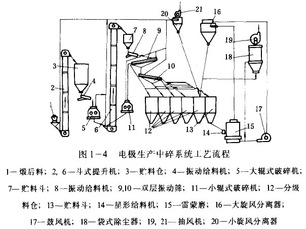 圖1—4為電極生產(chǎn)中碎系統(tǒng)綜合工藝流秤。由圖可見,鍛后料1由提升機(jī)2提升到儲料倉3,再由電磁振動給料機(jī)4加到輥式破碎機(jī)5,破碎后的料由提升機(jī)6提升到儲料斗7,再由電磁振動給料機(jī)8加到振動篩9,大于4mm的料進(jìn)入小對輥破碎機(jī)11繼續(xù)破碎,然后進(jìn)人提升機(jī)6。從振動篩9篩出的4—2mm的料進(jìn)入料倉12(進(jìn)到4—2mm分級科倉)。小于2mm的料進(jìn)入振動篩10,篩出的2—1mm、1—0.5mm、小于0.5mm的料分別進(jìn)入料倉12的各分級料倉中。料倉12中的不平衡料進(jìn)入貯料斗13,再經(jīng)溜槽和星形給料機(jī)14加到雷蒙磨15進(jìn)行磨粉。磨細(xì)的粉由鼓風(fēng)機(jī)17鼓進(jìn)的風(fēng)帶著經(jīng)過雷蒙磨上的分離器進(jìn)入旋風(fēng)分離器16,使粉與空氣分離,分離出來的細(xì)粉下列0075mm分級料倉中。經(jīng)分離后的空氣再經(jīng)鼓風(fēng)機(jī)吹入雷蒙磨。為了保持磨機(jī)內(nèi)一定的風(fēng)壓,多余的空氣被送到布袋除塵器18,除塵后的空氣由抽風(fēng)機(jī)19排放,粉塵下到0.075mm的分級料倉。