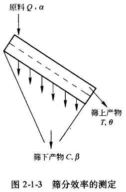式2-1-3是篩分效率的定義式,但實(shí)際生產(chǎn)中要測(cè)定c和Q是比較困難的,因此必須改用下面推導(dǎo)出的計(jì)算式來(lái)進(jìn)行。