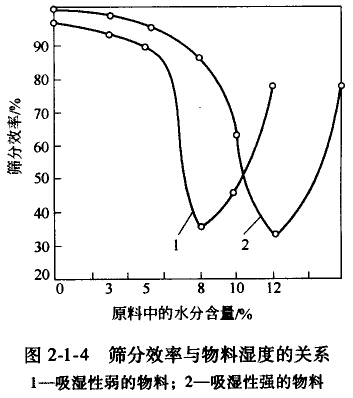 水分對(duì)某種物料的篩分過(guò)程的具體影響,只能根據(jù)試驗(yàn)結(jié)果判斷。篩分效率與物料濕度的關(guān)系見圖2-1-4。圖中,兩種物料所受酌影響是不同的,產(chǎn)生差別的原因可以由這兩種物料具有不同的吸濕性能來(lái)解釋。