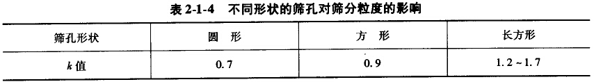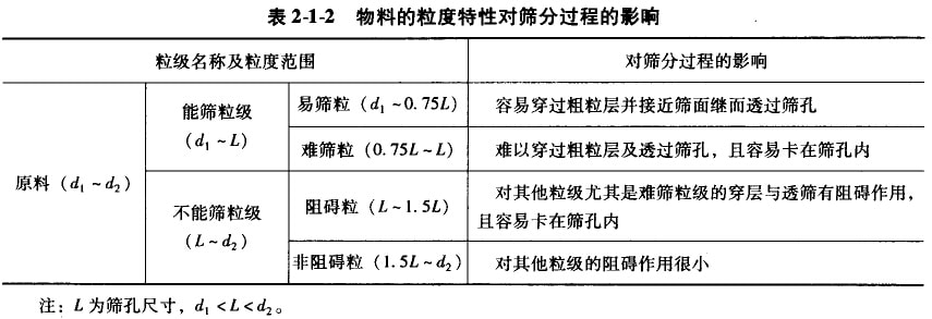 由表2-1-2中可知,原料中所含的難篩粒及阻礙粒相對(duì)其他粒級(jí)較多時(shí),對(duì)篩分過(guò)程不利:而所含的易篩粒和非阻礙粒相對(duì)其他粒級(jí)較多時(shí),對(duì)篩分過(guò)程有利。