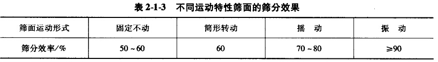 (1)篩面運(yùn)動(dòng)形式。篩面運(yùn)動(dòng)形式關(guān)系到篩上物料層的松散度及需要透篩的細(xì)物料相對(duì)篩面運(yùn)動(dòng)的速度、方向、頻率等,因而對(duì)分層、透篩過(guò)程均合影響。例如,物料在固定篩上的運(yùn)動(dòng),全靠物料在其本身重力的作用下滑移流動(dòng),篩分效果較差;在振動(dòng)篩上,物料的運(yùn)動(dòng)能量主要來(lái)自篩面的振動(dòng),料層不斷地充分松散,顆粒相對(duì)篩面不斷地劇烈沖撞,篩分效果較好:轉(zhuǎn)筒篩運(yùn)動(dòng)平緩,料層松散度不夠,粗、細(xì)顆粒經(jīng);祀s,使分層不連續(xù),物料相對(duì)篩面的運(yùn)動(dòng)速度較小,篩孔容易堵塞;搖動(dòng)篩上的物料主要是沿篩面方向滑動(dòng),在篩面法向的速度分量較小,不利于細(xì)粒透篩。幾種典型篩子的篩分效率大致如表2-1-3所示。