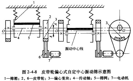 此外,還有一種軸承伯心式自定中心振動篩,圖2-4-9是它的示意圖。圖中表明,由于軸承與軸的中心線偏離距離A(約等于振幅),在振動中偏心鈾頸雖有向上或向下的位移,但皮帶輪相接文的位置卻是不變的。