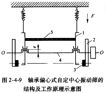 自定中心振動篩的結(jié)構(gòu)如圖2-4-8所示,與慣性振動篩相比較,不同的只是傳動軸4與皮帶輪2相聯(lián)接時,在皮帶輪上所開的軸孔的中心與皮帶輪幾何中心不同心,而是向偏心重塊3所在位置的對方,偏離皮帶輪幾何中心一個偏心距A。A為振動篩的振幅。因此,當(dāng)偏心重塊3在下方時,篩箱1及傳動鈾4的中心線在振動中心線O-O之上,距離為A。同樣由于軸孔在皮帶輪上是偏心的,因此,仍然使得皮帶輪2之中心與振動中心線O-O相重合。所以不管篩箱1和傳動軸4在運動中處于任何位置,皮帶輪2之中心O總是保持與振動中心線相重合,因而空間位置不變,即實現(xiàn)皮帶輪自定中心。大小兩皮帶輪的中心距保持不變,消除皮帶時緊時松現(xiàn)象。