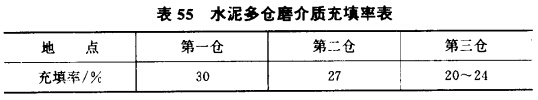 (3)細(xì)磨要求介質(zhì)充填率較小。介質(zhì)在球磨機(jī)中的運(yùn)動狀態(tài) 有兩種:拋落式狀態(tài)和瀉落式狀態(tài)。拋落式狀態(tài)以產(chǎn)生沖擊力為主,適合破碎粗粒礦石;瀉落式狀態(tài)則主要產(chǎn)生研磨作用,沖擊力較輕微,所以對細(xì)磨過程特別適應(yīng)。但是,只有在充填率較低的情況下才更容易產(chǎn)生瀉落態(tài),因此細(xì)磨過程的介質(zhì)充填率一般比粗磨過程低5%左右。表55所示為水泥多倉磨的介質(zhì)充填率情 況,可以看出,作為細(xì)磨階段的第三倉的介質(zhì)充填率明顯低于作為粗、中磨的第一、二倉。金屬礦磨礦也大致如此。