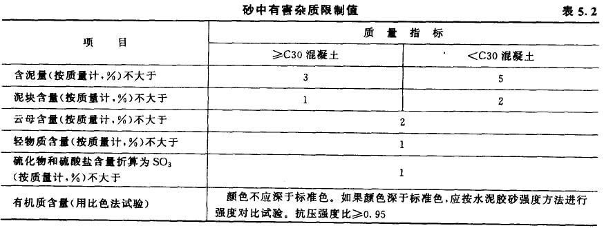 國標(biāo)JGJ52-92中對砂中有害雜質(zhì)含量的規(guī)定見表5.2。