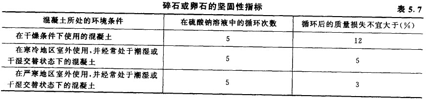 石子的堅(jiān)固性是指石于在氣候、環(huán)境變化或其他物理因素作用下,抵抗碎裂的能力。常用硫酸鈉溶液,將試件經(jīng)5次循環(huán)浸泡后,要求試件質(zhì)量的損失應(yīng)符合表5.7的規(guī)定。質(zhì)量損失越少,骨料越堅(jiān)固,其質(zhì)量也越好。