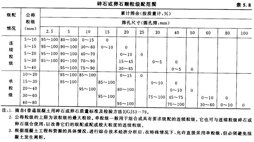 粗骨料的級(jí)配也是通過篩分實(shí)驗(yàn)來確定的,其標(biāo)準(zhǔn)篩孔徑為2.5mm、5mm、10mm、16mm、20mm、25mm、31.5mm、40mm、50mm、63mm、80mm及100mm十二個(gè)篩。分計(jì)篩余百分率、累計(jì)篩余百分率的計(jì)算與砂相同。依據(jù)標(biāo)準(zhǔn)JGJ53-92,普通混凝土用碎石及卵石的顆粒級(jí)配范圍應(yīng)符合表5.8的規(guī)定。