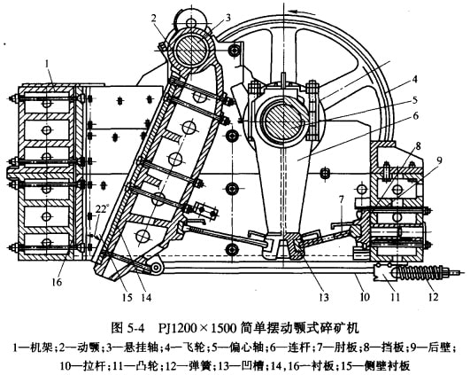 圖5-4是我國生產(chǎn)的PJ1200X 1500簡單擺動顎式破碎的剖視圖。這種碎礦機主要是由機架和支承裝置,碎礦的工作機構,傳動機構,保險裝置及排礦口調(diào)整裝置等幾部分組成。