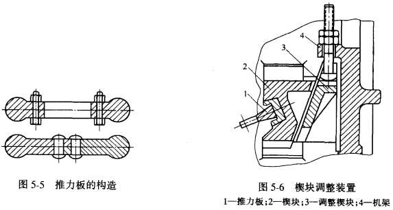 推力板又稱肘板,它是向動顎傳遞運動的一個桿件,同時用它作為保險裝置。改變其長度,還可以調(diào)整排礦口的大小。一般用鑄鐵鑄成整體,也有鑄成兩塊的,然后用螺栓或鉚釘連接起來。也有將肘頭和肘身分開制造,如圖5-6所示,然后用媒栓或鉚釘連接起來。