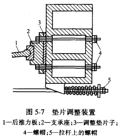 如圖5-7所示,在后推力板1的支承座2后面放人一組厚度相同的墊片3,改變墊片的數(shù)量,即可達到調(diào)整排礦口大小的目的。在調(diào)整排礦口 時,要先將螺帽4及拉桿彈簧螺帽5松開,然后增加或減少墊片的數(shù)目,待排礦口調(diào)整好后,再將螺帽4上緊,并調(diào)整彈簧上的螺帽5。用此法可以達到多級調(diào)整,調(diào)整 時也比較方便,同時可以使機器結構緊湊和質(zhì)量減小。 但調(diào)整時必須停車。這種方法常用在大、中型碎礦機上。