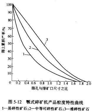 顎式碎礦機要求給礦均勻,所以都設(shè)有專門的給礦設(shè)備,顎式碎礦機的產(chǎn)品粒度特性曲線如圖5-12所示,破碎產(chǎn)物的粒度特性曲線,決定于被破碎礦石的硬度。產(chǎn)品粒度特性曲線不僅反映出碎礦機的工作性能,而且為碎礦機排礦口的調(diào)整,提供了可靠的依據(jù)。