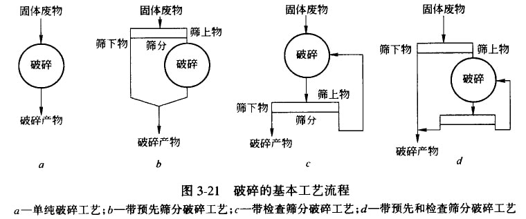 到目前為止,對固體廢物的破碎多采用機(jī)械方法,破碎設(shè)備通常也是由兩種或兩種以上的破碎方法聯(lián)合作用對廢物進(jìn)行破碎的。根據(jù)固體廢物的性質(zhì)、顆粒大小和選用的破碎機(jī)類型,每段破碎流程都可以有不同的組合方式,其基本的工藝流程如圖3-21所示。