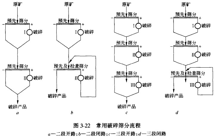 目前,在礦業(yè)固體廢棄物資源化處理廠,中小型處理廠多采用二段或三段破碎流程;大型處理廠多采用三段破碎流程。近年來,從節(jié)能觀點(diǎn)出發(fā),為減小磨機(jī)給礦粒度,有時也采取“多破少磨”的措施。圖3-22所示為選礦廠較典型的破碎篩分流程。