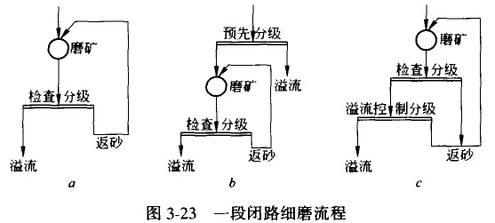 圖3-23a所示為常見的設(shè)有檢查分級的一段閉路細(xì)磨流程;若原料粒度較細(xì),含合格產(chǎn)品在15%以上時,可采用加預(yù)先分級的一段閉路細(xì)磨流程(圖3-23b);若對最終細(xì)磨產(chǎn)品要求比較細(xì)時,可采用加路流控制分級的一段閉路細(xì)磨流程(圖3-23c)。