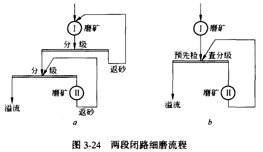 圖3-24a所示為兩段全閉路紉磨分級流程,適用于磨碎到0.15mm或更細(xì)的要求,其缺點(diǎn)是兩段細(xì)磨負(fù)荷不易均衡地分配。圖3-24b是兩段一閉路細(xì)磨分組流程,其特點(diǎn)是生產(chǎn)能力較大,如果第一段采用棒磨機(jī)可以增大細(xì)磨機(jī)給礦粒度,使破碎流程在開路情況下有效地工作,但它只在設(shè)計(jì)大型廠時才有條件被采用。