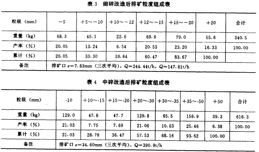 (1)檢測(cè)數(shù)據(jù)(表1-表4)表明:腔型優(yōu)化改造后,破碎效果有明顯改善。排礦細(xì)粒級(jí)增加,細(xì)碎排礦中-15mm粒級(jí)含量由44.85%增至60.47%,增加了15.62%;+20mm粒級(jí)含量由26.13%降至16.33%,降低了9.8%;中碎排礦-15mm粒級(jí)含量由22.80%增至28.78%,增加了5.98%,中碎排礦最大粒級(jí)由75mm降至50mm,+50mm粒級(jí)含量由21.28%降至6.38%,降低了14.9%。