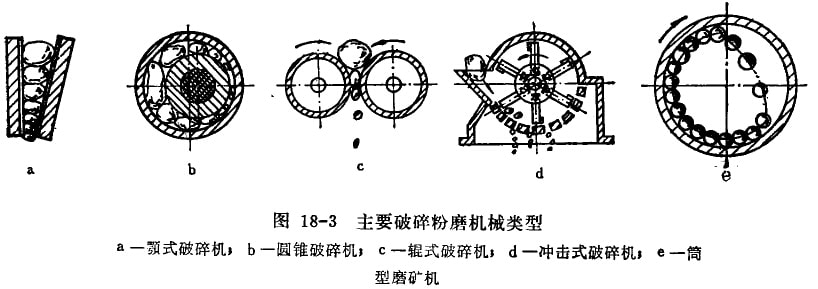 選礦廣所使用的粉碎機(jī)械可歸納為破碎機(jī)械和磨礦(粉磨)機(jī)械兩大組;而破碎機(jī)按給礦和產(chǎn)品的粒度大小又可分為粗碎、中碎和細(xì)碎破碎機(jī)。常用的粉碎機(jī)械按其粉碎方法、工作原理和結(jié)構(gòu)特征,基本上可分成以下幾種類(lèi)型。