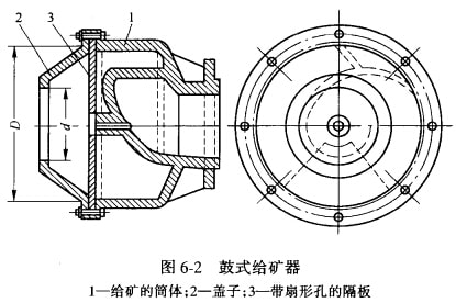 鼓式給礦器如圖6-2所示,只用于給料位置高于球磨機軸線的場合。它一般用于開路磨礦, 將破碎產(chǎn)品送入球磨機進行磨碎。它由筒體1、蓋子2和帶有扇形孔的隔板3組成,三者用螺釘固定聯(lián)接。筒體由鑄鐵制成,或用鋼板焊接,在內(nèi)部有縲旋形隔板。蓋子2是截錐形短筒,左方為進料孔。當物料由此給入后,經(jīng)過隔板的扇形孔進入筒體,由筒體內(nèi)部的螺旋形舉板將物料舉起,自右方送入球磨機的中空軸頸內(nèi)。這種&料器的給料粒度可達70 mm。