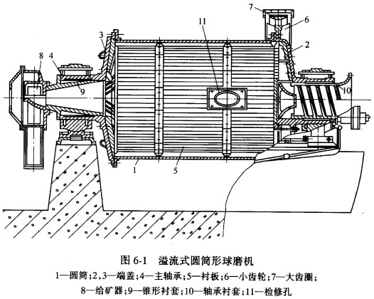 溢流型球磨機的構(gòu)造如圖6—l所示。主要由筒體、端蓋、主軸承、中空袖頸、傳動齒輪和給礦器等部分組成。