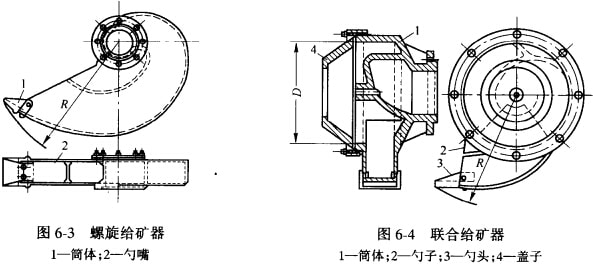 聯(lián)合給礦器是鼓式給礦器和蝸式給礦器聯(lián)合起來的給礦器,如圖6-4所示,筒體1和蓋子4與鼓式給礦器相似,而勺子2和勺頭3又與蝸式給礦器相似。粗粒給料可通過蓋子4的孔直接由螺旋形隔板提升后進入中空軸頸,在返砂槽中的返砂由勺子舀起后經(jīng)筒體內(nèi)的螺旋形隔板送入中空軸頸。聯(lián)合給礦器適用于閉路磨礦流程。