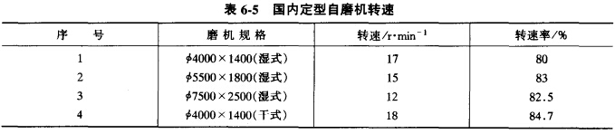 轉(zhuǎn)速率是自磨生產(chǎn)中非常重要的參數(shù)之一,然而,國(guó)內(nèi)目前定型的自磨機(jī)轉(zhuǎn)速均已固定,無伸縮余地,如表6-5所示。