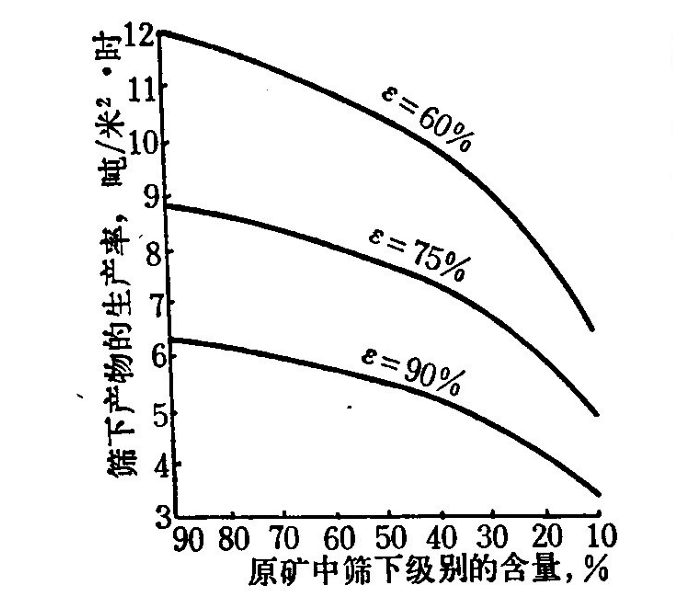 在篩分效率等值的情況下,生產(chǎn)率與篩下級(jí)別含量的關(guān)系