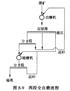 兩段全自磨流程是指第一段用自磨機粗磨,第二段用礫磨機進行細磨的磨礦工藝,如圖8—9 所示。因礫磨機的磨礦介質(礫石)取自第一段自磨機,從實質上說它也算是礦石自磨。第一段自磨機可在閉路條件下工作,也可開路工作。而第二段則都采用閉路磨礦,礫磨機用的礫石可由破碎系統(tǒng)供給,也可由自磨機(開礫石窗)供給。