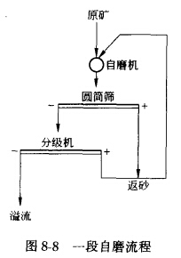 一段自磨流程如圖8—8所示,可分為一段全自磨和一段半自磨兩種。