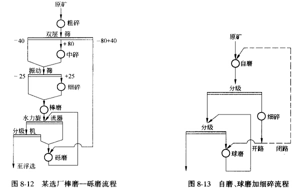 對于不適合于用自磨機組磨的硬度較大的礦石,可采用先將礦石破碎后再用棒磨機作為第 一段粗磨,從破碎產物中篩出部分礫石作為礫磨機介質進行第二段細磨的兩段半自磨流程,我國某銅礦選礦廠就是采用這種棒磨加礫磨流程的,如圖8—12所示,該廠處理的是含銅矽卡巖類型礦石,普氏硬度系數f=12—16,要求磨礦紉度為—200目占65%。實踐表明,這種流程對礦石的適應性較廣泛,礫石的大小和數量易控制,生產條件比較穩(wěn)定,操作容易掌握。礫磨中的難磨粒級是通過間斷排出并送回棒磨機再磨的辦法來處理的。