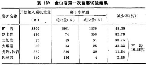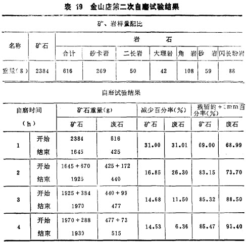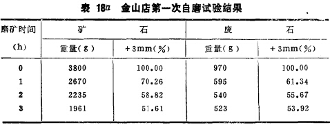 我國湖北金山店鐵礦采用濕式自磨機,礦石中混入廢石較 多,且廢石比礦石難磨。為了探索礦石和廢石的可磨性,將45~ 55mm的礦石及廢石作適當(dāng)配比,用240 x 200mm錐形球磨機不加鋼球進行自磨試驗。每磨一小時后,將-3mm以下的粉礦排除,然后將磨機內(nèi)剩余的部分稱重。第一次試驗的結(jié)果列于表18a、18b。由表18b看出,除矽卡巖外,其他巖石比礦石難磨,在生產(chǎn)中可能形成對自磨不利的頑石積累。第二批試驗方法與第一批相似,但磨一小時后,將-3mm排除,然后按第一批試驗的減少率加入大致相近的礦石與巖石量,結(jié)果列于表19。表19表明,自第三和第四小時后,礦石的減少率比廢石髙,且趨于穩(wěn)定,而磨機中殘存的+ 3mm廢石率卻愈積愈高,形成頑石積累。