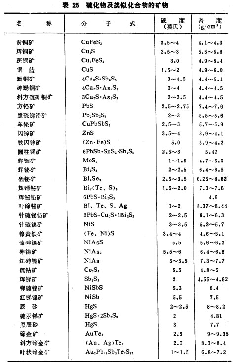 (2)硫化物及其類似化合物類礦物。此類礦物多為極性 共價鍵或混合鍵聯(lián)結(jié),這是工業(yè)上有很大實際意義的一大類礦物,共有350多種,常見的主要是Cu、Pb、Zn、Hg、 Ni、Co、 Mo、Cd、Bi等金屬與S、Se、Te、As形成化合物。此類礦物的硬度一般不高,大都欠2?4之間,少數(shù)為5?6,仍密度較大,多數(shù)在4以上。常見的硫化物及類似化合物如表25所列。此類礦物由于硬度低、密度大、在磨碎時常常優(yōu)先被粉碎。這正是選礦廠所得精礦的平均粒度一般均比尾礦細的基本原因。