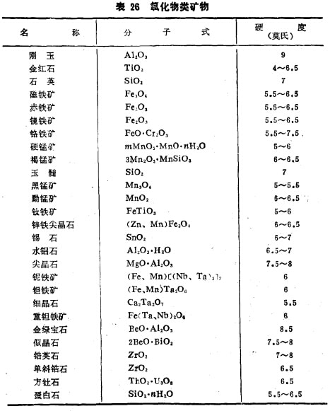 (3)氧化物類礦物。這也是自然界存在較多的一類礦物, 主要為離子鍵(二價金屬氧化物),但隨著金屬離子價態(tài)的升髙也有向共價鍵過渡的特點(三價或四價金屬氧化物)。表26列出一些常見的氧化物類礦物。此類礦物的硬度一般較大,莫氏硬度在5,5以上,物理化學性質(zhì)穩(wěn)定。