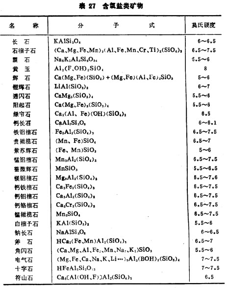 (5)含氧鹽類礦物。這是一類數(shù)量眾多的礦物,約占已知礦物數(shù)量的三分之二,其中包括硅酸鹽、碳酸鹽、琉酸鹽、磷酸鹽、鎢酸鹽等若干個亞類。此類礦物的陰離子對外部陽離子是離子鍵結(jié)合,但陰離子內(nèi)部(即"根")卻是共價鍵結(jié)合。值得注意的是硅酸鹽礦物,一是數(shù)量大,約占已知礦物的三分之一,按重量計則占地殼重量的75%; 二是它們?yōu)橹饕鞄r曠物,是選礦的主要脈石成分,也是磨碎的主要對象;三是基本構(gòu)造單位為硅氧四面體【SiO4】, Si+4與四個頂角氧形成共價結(jié)合,故硬度很大,難磨碎。表27中列出常見的主要硅酸鹽類曠物。