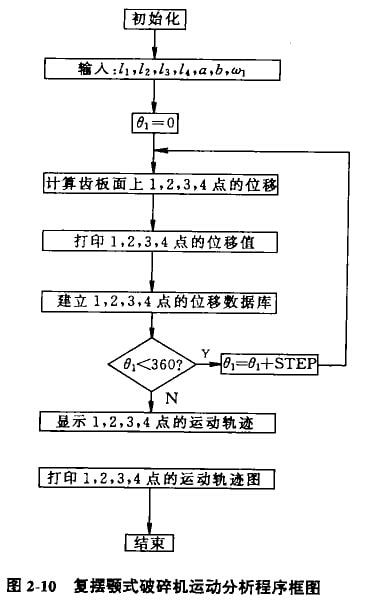 以600 x 900復擺領式破碎機為例進行計算機輔助分析。已知:l1=0.019m,l2=1.43m、l3=0.46m,l4=1.22m,w1=26.18s-1。為了簡化計算而又能說明問題,在動顎齒板面上任取四點.每點對應的ai值分別為0.35m,0.78m,1.10m和1.43m,對應的bi,值分別為0.445m,0.44m,0.437m和0.435m。當偏心軸轉(zhuǎn)一周,即θ1從O°變化到360°時,由式(2-3)—式(2-5)和已知條件可計算出齒板面上1—4點的位移并繪出相應點的運動軌跡圖,其程序框如圖2-10所示。點的運動軌跡圖中,箭頭所在位置是θ1等于0°時點的起始位置,箭頭所指方向是點運動的方向。