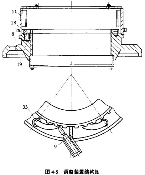 偏心軸套31支承在由三片圓盤組成的止推軸承27上.最下面的鋼圓盤固定在機(jī)架下蓋28上,上面的鋼圓盤與偏心軸套用銷釘相聯(lián),并隨之轉(zhuǎn)動(dòng),而中間的青銅圓盤則作相對(duì)滑動(dòng)。青銅圓盤的總厚度每年至少要檢查兩次,因?yàn)榍嚆~圓盤磨損后,就要減少圓錐齒輪的嚙合間隙。圓錐齒輪嚙合側(cè)面向隙不足.就會(huì)在齒面和傳動(dòng)軸的軸展上產(chǎn)生很大的附加負(fù)荷。圓錐齒輪的嚙合間隙,如圖4—4所示。其值見(jiàn)表4-3。
