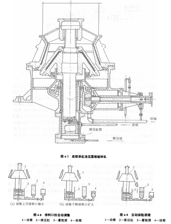 這種破碎機排料口的調(diào)整是通過油缸中袖量的增加或減少校動錐上升或下降,從而使排料口減小或增大,如圖4-8所示。