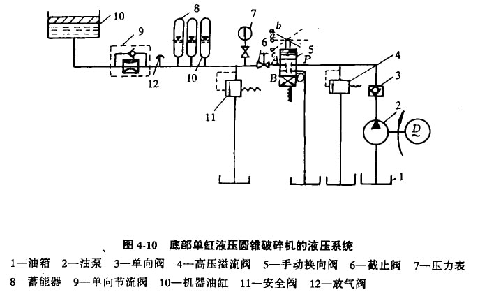 非破碎物排出后,氣體壓力又高于油壓,則進入蓄能器內(nèi)的油又被壓回伯缸,使破碎錐恢復(fù)正常工作位置。這種破碎機的液壓系統(tǒng)如圖4-10所示。