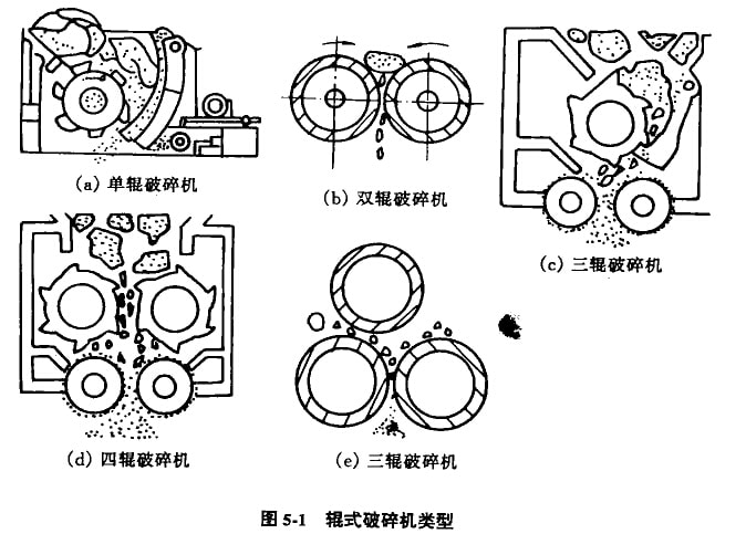近年來,國外輥式破碎機發(fā)展得很快,種類也很多,規(guī)格比較齊全。按輥子的數(shù)目,輥式破碎機可以分為單輥、雙輥、二輥和四輥四種;按輥面形狀,可分為光輥、齒輥和槽形輥破碎機,輥式破碎機的類型如圖5-1所示。