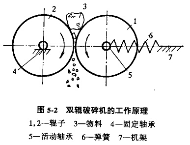 以圖5-2所示的雙輥破碎機為例來介紹其工作原理。輥子2支承在固定軸承4上,輥子1支承在活動軸承5上;顒虞S承5借助彈簧6推向左方的擋塊位置處。兩輥子由電動機帶動相向轉(zhuǎn)動,物料經(jīng)給料箱給入兩輥子之間。物料由于受輥子與物料之間摩擦力作用,而被帶入兩個輥子之間的破碎腔內(nèi),受擠壓破碎后,自下部排出。兩輥子之間的最小間隙稱為排料門寬度,破碎產(chǎn)品的粒度即由它的大小來決定。
