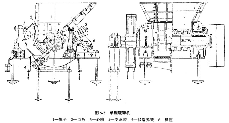 單輥破碎機是在輥子與裝在輥子對面的絞接襯板之間進行破碎工作的。襯板可以是光面的、帶溝槽的或是帶齒的.而輥子表面必須是帶齒的。由于襯板是絞接的,其角度位置可以調(diào)整,從而可改變襯板與輥子之間的距離。襯板由彈簧支承。當非破碎物進入破碎腔時,襯板向后退讓,排出非破碎物,因而也起破碎機的保險裝置作用。