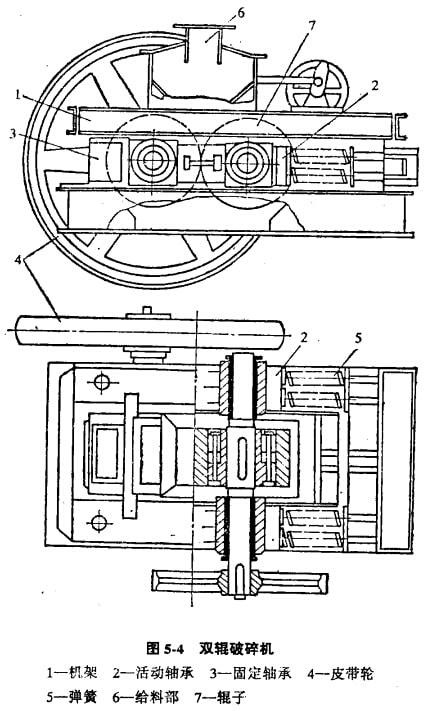 常用的一種輥子破碎機是雙輥破碎機,它的構(gòu)造如圖5-4所示。它由機架、一對輥子、三角度帶傳動裝置和彈簧保險裝謹?shù)戎考M成。兩臺電機通過皮帶輪4傳動,帶動兩輥子7相向轉(zhuǎn)動。一個輥子的油文求在與機架固定在一起的固定軸承3上,另一個輥子的軸支承在活動軸承2上。活動軸承2可以沿機架尋軌水平移動,使兩輥子間的排料口寬度在必要時可以增大,將非破碎物排出機外。