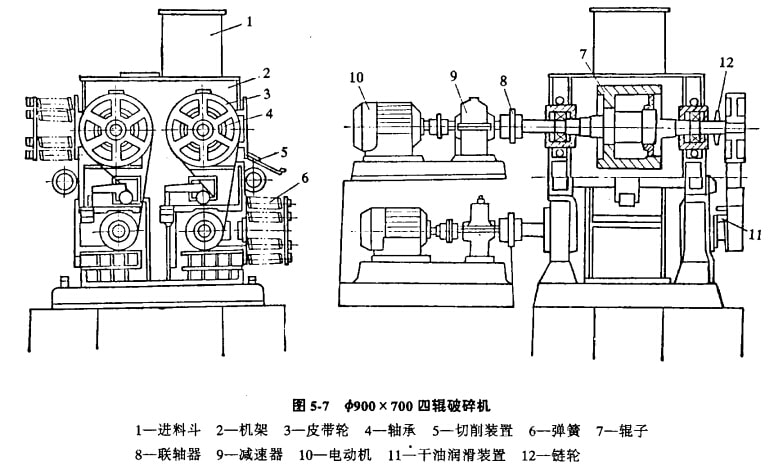 四輥破碎機實質(zhì)上是由兩臺規(guī)格相同的雙輥破碎機里疊組成的。圖5-7是φ900x700四輥破碎機結(jié)構(gòu)。從輥子7的構(gòu)造和彈簧保險裝置6上看,它與對輥機沒有什么區(qū)別。但是,它的輥子軸是支承在自動調(diào)心滑動軸承4上;它的傳動裝置是由兩臺電機10、兩臺減速機9、兩套皮帶輪3傳動組成的。