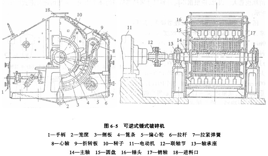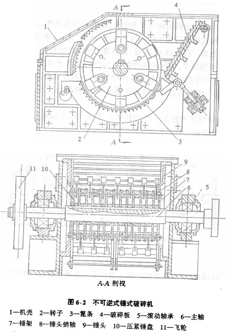 圖6-2是單轉子不可逆式錘式破碎機。它由機殼1、轉子2、篦條3、打擊板4和軸承5等部分組成。